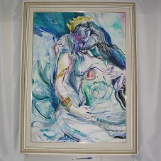 PINTURA SOBRE TELA (73X102,5 CM), RETRATA A FIGURA DE UMA MULHER DE CABELOS NEGROS E LONGOS, USANDO UMA COROA E BRACELETE DOURADOS E SE OLHANDO NO ESPELHO. EM SEU PEITO, NA COR VERMELHA, UM CORAÇÃO. NA PAISAGEM AO FUNDO, PREDOMINAM AS CORES VERDE, AZUL E ROSA. NO CANTO INFERIOR ESQUERDO, A ASSINATURA DO AUTOR. COM MOLDURA (92,7X122,5 CM) E PASSE-PARTOUT CREME COM DETALHES DOURADOS. ATRÁS A INSCRIÇÃO 'TÍTULO: 'RAINHA DAS ÁGUAS' / AQUERELA. / AUTOR: EGAS FRANCISCO - 2.004 - CAMPINAS. S.P.'.