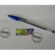 SELO POSTAL (59X25 MM) COMEMORATIVO AO CENTENÁRIO DO NASCIMENTO DE JUSCELINO KUBITSCHEK, COM ARTE DE LUCIOMAR S. JESUS. RETRATA, EM PRIMEIRO PLANO, JUSCELINO. PREDOMINANDO AS CORES VERDE, AMARELO E AZUL, SURGINDO SOBRE ELAS, A PRAÇA DOS TRÊS PODERES, O PALÁCIO DA ALVORADA, O CATETINHO E A CATEDRAL DE BRASÍLIA. FOI UTILIZADA A TÉCNICA PVA SOBRE PAPEL. COLADO SOBRE PAPEL CARTÃO BRANCO, COM MARCA DO CORREIOS E DOIS CARIMBOS 'FESTA DOS ESTADOS 2004 / O BRASIL EM BRASÍLIA / 9 A 11/7/2004 / CORREIOS - BRASÍLIA - DF'. ACOMPANHA FOLDER INFORMATIVO 'EDITAL 6 - 2002', COM DESCRIÇÃO DO SELO E BIOGRAFIA DE JUSCELINO KUBITSCHEK. ACONDICIONADO EM PASTA DE COURO PRETA, COM LOGOMARCA DOS CORREIOS NA FRENTE.