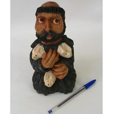 ESCULTURA EM MADEIRA (10X21 CM) DE SÃO FRANCISCO DE ASSIS, AJOELHADO COM TRÊS POMBOS BRANCOS EM SUAS MÃOS. NO FUNDO DA ESCULTURA A INSCRIÇÃO 'A. JORGE'. POSSUI CERTIFICADO DE LEGITIMIDADE DE PRODUTO ARTESANAL.