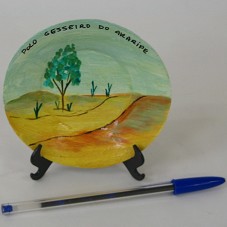 PRATO DECORATIVO (11 CM). EM SEU INTERIOR, DESENHO DE UMA PAISAGEM E A INSCRIÇÃO 'POLO GESSEIRO DO ARARIPE'. POSSUI SUPORTE DE PLÁSTICO. ACONDICIONADO EM UMA SACOLA TNT, NA COR ROSA.