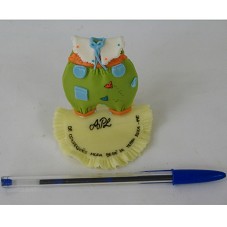 ARTESANATO EM BISCUIT (7X8 CM), NA FORMA DE ROUPA DE BEBÊ, NAS CORES LARANJA, VERDE E BRANCA COM DESENHO DE PASSARINHOS E OS BOLSOS NA COR AZUL. BASE, TAMBÉM EM BISCUIT, NA COR AMARELA COM A INSCRIÇÃO 'APL / DE CONFECÇÕES MODA BEBÊ DE TERRA ROXA-PR' E ATRÁS 'LO ART'S / (044) 645-3456 / TERRA ROXA-PR'.