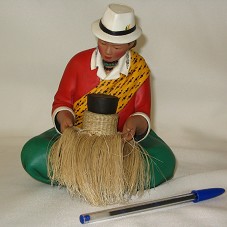 ARTESANATO (15X17 CM), FEITO EM CERÂMICA, NA FORMA DE UMA MULHER SENTADA, COM VESTES TÍPICAS, NAS CORES VERMELHA, AMARELA E VERDE, USANDO UM CHAPÉU BRANCO E BRINCOS DE METAL, COM TRANÇA NOS CABELOS, FAZENDO OBJETO ARTESANAL COM PALHAS. ACOMPANHA UM CARTÃO COM A INSCRIÇÃO 'REPUBLICA DEL ECUADOR / PRESIDENCIA DE LA REPÚBLICA / DRA. XIMENA BOHORQUEZ DE GUTIERREZ / PRIMERA DAMA DE LA NACIÓN'. ACOMPANHA DOIS FOLHETOS 'FOLKLORE OLGA FISCH'.