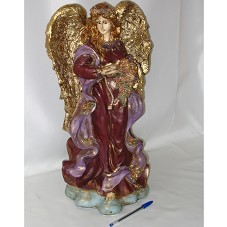 ESCULTURA DE ANJO (48 CM) EM GESSO, VESTIDO COM TÚNICA VINHO E MANTO LILÁS, SEGURANDO UM BUQUÊ DE FLORES E UMA POMBA. POSSUI ASAS DOURADAS E COROA DE FLORES NA CABEÇA.