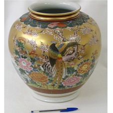 VASO DECORATIVO (29X30 CM) EM PORCELANA BRANCA, COM BOLO ALARGANDO NA PARTE SUPERIOR. GARGALO PINTADO EM DOURADO E VINHO. NA FRENTE, PINTURA DE UM PÁSSARO EM UMA ÁRVORE, COM DIVERSAS FLORES AO SEU REDOR, PREVALECENDO OS TONS DE DOURADO, AZUL, VERMELHO E VERDE. NO FUNDO DA BASE, IDEOGRAMAS JAPONESES. ACOMPANHA FOLHETO COM FOTO E DIMENSÃO DO OBJETO; QUATRO PANFLETOS VERDES COM INSCRIÇÃO JAPONESA; E UM FOLDER 'KUTANI' EM INGLÊS E JAPONÊS, FALANDO UM POUCO DA ARTE. ACONDICIONADO EM CAIXA DE MADEIRA (33,5X33,5X34 CM) COM IDEOGRAMAS JAPONESES NA TAMPA. ESTA, ENCONTRA-SE EMPENADA.
