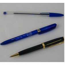 DUAS CANETAS (13 E 14 CM) TIPO ROLLER. A PRIMEIRA, EM METAL DOURADO E RESINA VERDE, COM A INSCRIÇÃO 'MANAUS - AMAZONAS - BRASIL / SETEMBRO 2004 / II FEIRA INTERNACIONAL DA AMAZÔNIA'. A SEGUNDA EM PLÁSTICO AZUL, COM A MESMA GRAVAÇÃO DA ANTERIOR MAIS 'SUFRAMA / MINISTÉRIO DO DESENVOLVIMENTO, INDÚSTRIA E COMÉRCIO EXTERIOR / GOVERNO FEDERAL'. ACONDICIONADAS EM ESTOJO PLÁSTICO PRETO (15X6X3 CM).