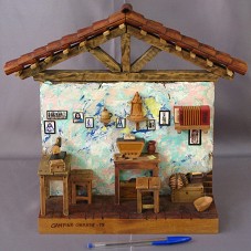 MINIATURA (35,5X31,5 CM) DE UM CÔMODO DE UMA CASA, PARA PENDURAR EM PAREDE, MOSTRANDO DUAS MESAS, UMA COM MÁQUINA DE COSTURA E OUTRA COM UM RÁDIO EM CIMA, CADEIRAS, UM BAÚ COM CESTA E FERRO DE PASSAR ROUPA EM CIMA, DIVERSOS QUADROS COM IMAGENS SACRAS, UMA IMAGEM DE UMA SANTA E UM ACORDEÃO EM PRATELEIRAS NA PAREDE. NA BASE, A INSCRIÇÃO 'CAMPINA GRANDE-PB'. ATRÁS, 'PASCHOAL'. ACONDICIONADA EM SACO DE PANO BEGE COM UM ADESIVO 'A PARAÍBA EM SUA MÃOS / WWW.PARAIBA.PB.GOV.BR', E DENTRO DE UMA CAIXA DE PAPEL RECICLADO (38,5X34,5X10,5 CM).