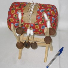 ARTESANATO, MINIATURA DE UMA ALMOFADA PARA BORDAR RENDAS (16X10 CM), COM INÍCIO DE UMA RENDA DE BILRO BORDADA. APOIADA EM CAVALETE DE MADEIRA (12X15X16 CM). ACOMPANHA DOIS FOLDERS DO 'CEART / CENTRAL DE ARTESANATO DO CEARÁ'. ACONDICIONADA EM CAIXA DE PAPELÃO (13X16X24,5 CM).