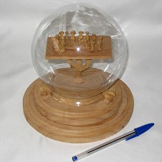 ESCULTURA EM MADEIRA (18 CM, MEDIDA DA PEÇA COMPLETA), REPRESENTANDO CANGACEIROS SENTADOS NO CHÃO, EM VOLTA DE UMA TOALHA ONDE HÁ COMIDAS E BEBIDAS. O CHÃO/BASE ESTÁ NO TOPO DE UM PÉ DE MANDACARU. FIXADA EM BASE DE MADEIRA CIRCULAR ESCALONADA (18,5X5 CM) E PROTEGIDA POR REDOMA DE VIDRO, EM FORMA DE GLOBO. NO FUNDO DA BASE, ETIQUETA CONTENDO TÍTULO E AUTOR DA OBRA, ALÉM DO NOME GRAVADO NA BASE. ACOMPANHA CARTÃO DO REMETENTE, OFERECENDO O PRESENTE À PRIMEIRA DAMA. ACONDICIONADO EM CAIXA DE PAPELÃO (20,5X20,5X20 CM).