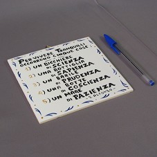 AZULEJO (15,5X15,5 CM) BRANCO, PINTADO NAS BORDAS DE AZUL E AMARELO, COM INSCRIÇÃO EM PRETO, 'PER VIVERE TRANQUILLI OCCORRONO CINQUE COSE: 1) UN BICCHIERE DI SCIENZA / 2) UNA BOTTIGLIA DI SAPIENZA / 3) UN BARILE DI PRUDENZA / 4) UNA BOTTE DI COSCIENZA / 5) UN MARE DI PAZIENZA / S. ALFONSO'.