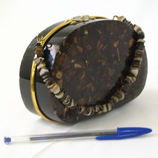 BOLSA FEMININA (15x5,5x10,5 CM) COM TEXTURA DE CASCA DE COCO, COBERTA POR RESINA EM TOM DE MARROM ESCURO. ACABAMENTO EM METAL DOURADO E ALÇA EM PEDRAS DE TONS MARROM. INTERIOR FORRADO EM CETIM PRETO.