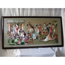 BORDADO EM SEDA (138X67 CM), EM TONS DE VERDE, BRANCO, VERMELHO, MARROM E AZUL, MOSTRANDO MULHERES CHINESAS NO JARDIM DE UMA CASA. PASSE-PARTOUT EM TECIDO ESVERDEADO COM MOTIVO FLORAL. MOLDURA EM MADEIRA LAQUEADA (166X86 CM) EM TONALIDADE VINHO. SUPORTES DE FIXAÇÃO EM METAL DOURADO.