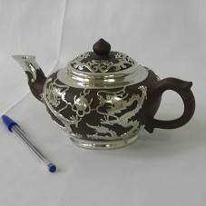 CHALEIRA COM TAMPA (20X12X9 CM), EM CERÂMICA MARROM, COM ACABAMENTO E ADORNOS EM PRATA. NOS ADORNOS, DESENHOS DE DRAGÕES E PEIXES. ACONDICIONADA EM CAIXA (17X17X12,5 CM) FORRADA DE TECIDO ESVERDEADO, COM INSCRIÇÕES CHINESAS NA PARTE FRONTAL. ACOMPANHA FOLHETO EM CHINÊS E INGLÊS.