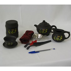 CONJUNTO DE CHÁ, EM CERÂMICA PRETA, COMPOSTO POR: SEIS XÍCARAS (SEM ALÇA) E SEIS PIRES; UM BULE; UMA JARRA; UM POTE COM TAMPA; UM COADOR EM METAL; UM TECIDO ATOALHADO NA COR VINHO, COM IDEOGRAMAS CHINESES; E, UMA PINÇA E PALITO EM PLÁSTICO PRETO. AS PEÇAS CERÂMICAS POSSUEM PINTURA DE UM DRAGÃO. ACOMPANHA CERTIFICADO DE GARANTIA. ACONDICIONADO EM CAIXA (33X44X12 CM) VINHO, COM IDEOGRAMAS NA TAMPA.