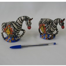 GALHETEIRO EM FORMA DE ZEBRA (11X5X9 CM), COMPOSTO POR DUAS PEÇAS EM CERÂMICA. FUNDO DA BASE COM ABERTURA TAMPADA COM ROLHA. ACOMPANHA CARTÃO DE APRESENTAÇÃO DA REMETENTE. ACONDICIONADO EM CAIXA AZUL MARINHO (22X21,5X16,5 CM) COM SÍMBOLO DA REPÚBLICA DA ÁFRICA DO SUL NA TAMPA.