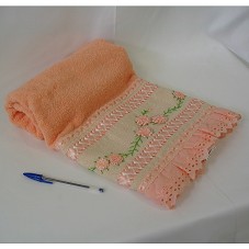 TOALHA DE BANHO (70X140 CM) NA COR SALMÃO. POSSUI BARRA COM BORDADO DE ROSAS (EM FUXICO) E MIÇANGAS, FITAS DE CETIM E RENDA. ACONDICIONADA EM EMBALAGEM PLÁSTICA.