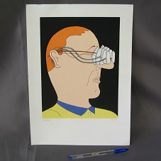 GRAVURA (25,5X35,5 CM), DE NÚMERO 222/300. SERIGRAFIA MOSTRANDO PERFIL DE ROSTO MASCULINO COM CAMISA AMARELA E GOLA AZUL, USANDO CINCO ÓCULOS. POSSUI A INSCRIÇÃO '222/300 / CIPIS'.