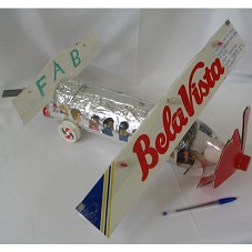 AEROMODELO ARTESANAL (20X50X49 CM), SENDO A FUSELAGEM DO AVIÃO FEITO COM GARRAFA PET DE REFRIGERANTE ENVOLTA COM PAPEL ALUMÍNIO; O TREM DE ATERRISSAGEM COM RODAS DE PLÁSTICO, A HÉLICE COM PAPELÃO E TAMPA DE GARRAFA PET E AS ASAS E O CONJUNTO DA CAUDA COM PAPELÃO E LÂMPADA DE PISCA-PISCA. COLADOS NA FUSELAGEM DO AVIÃO DESENHOS DE PESSOAS E NA CABINE UMA FOTO DO PRESIDENTE LULA. NA ASA DIANTEIRA AS INSCRIÇÕES 'BELA VISTA / TRABALHO FEITO PELA: ALUNA: HELLEN LIMA ALVES. / 3ª SERIE / PROF: JOSELMA / ESCOLA: VEREADOR JOSÉ ALVARENGA. / (CAMPO BELO-MG) / BRASIL DE TODAS A RAÇAS / ORDEM E PROGRESSO' E O DESENHO DA BANDEIRA NACIONAL. NA ASA TRASEIRA 'CAPPUCINO PADRE VICTOR / FAB' E NO CONJUNTO DA CAUDA 'FAB'.
