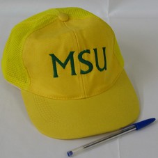 BONÉ AMARELO COM A INSCRIÇÃO 'MSU' (MOVIMENTO DOS SEM UNIVERSIDADE)BORDADO EM VERDE NA FRENTE.