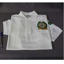 CAMISA GOLA PÓLO BRANCA (TAM G), COM BOLSO NA PARTE FRONTAL. NA MANGA ESQUERDA, A BANDEIRA DO BRASIL BORDADA. NA FRENTE, BRASÃO DO 'CF SOL 8º BIS / TABATINGA / AMAZONAS / LUTAR SEMPRE DESISTIR NUNCA'.