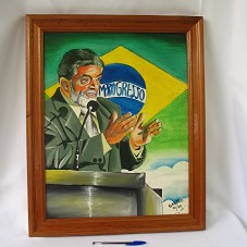 PINTURA SOBRE TELA (42X53,5 CM) MOSTRANDO O PRESIDENTE LUIZ INÁCIO LULA DA SILVA DISCURSANDO, TENDO A BANDEIRA DO BRASIL AO FUNDO. PREDOMINA OS TONS DE CINZA, VERDE, AZUL, AMARELO E BRANCO. NO CANTO INFERIOR DIREITO, 'SANDRO / 01/05'. MOLDURA EM MADEIRA CLARA (52X63,5 CM) E FUNDO EM EUCATEX.