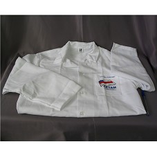 JALECO (TAM G) BRANCO, DE MANGA COMPRIDA. NO BOLSO FRONTAL SUPERIOR, ESTAMPA DE UMA BANDEIRA E 'CURSO TÉCNICO DE ENFERMAGEM / CETAM / CENTRO DE EDUCAÇÃO TECNOLÓGICA DO AMAZONAS'.