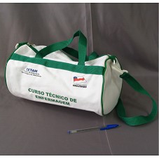 BOLSA (33X19X18 CM) EM LONA BRANCA COM DETALHES VERDES. NA FRENTE, ESTAMPA DA BANDEIRA DO AMAZONAS E 'CURSO TÉCNICO DE ENFERMAGEM / CETAM / CENTRO DE EDUCAÇÃO TECNOLÓGICA DO AMAZONAS'. POSSUI ALÇA LONGA E CURTA.