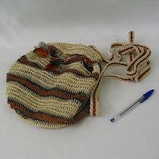BOLSA (TIPO MOCHILA) EM PALHA (16X16X28 CM), COM LISTRAS HORIZONTAIS NAS CORES MARROM E CINZA-AZULADO. POSSUI DOIS BOTÕES DE SEMENTES (VERMELHA E PRETA) E CORDÃO EM PALHA COM PENAS COLORIDAS NO FINAL.
