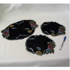 JOGO COM TRÊS PANOS (32x22 E 2 DE 22X19 CM) EM CAMURÇA AZUL MARINHO, COM PINTURA PIROGRAVADA COM MOTIVOS FLORAIS, PREDOMINANDO OS TONS DE AZUL, ROSA E VERDE, COM REALCES BRANCOS. ACOMPANHA PAPEL INFORMANDO ENDEREÇO DA INSTRUTORA E AUTORA, E TÉCNICA DO ARTESANATO.