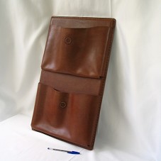 REVISTEIRO DE PAREDE (36X60X11 CM) EM COURO MARROM, COM DOIS BOLSOS NA PARTE FRONTAL. ATRÁS, ETIQUETA 'ADRIANA A. TAVERA / TALLER MANUAL / 1999 / COLOMBIA'. ACONDICIONADO EM SACOLA DE FELTRO ESVERDEADA, COM MESMA ETIQUETA NA PARTE FRONTAL. ACOMPANHA CARTÃO POSTAL COM OBRA DA ARTISTA.