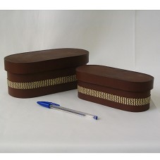 DUAS CAIXAS OVALADAS EM COURO (20,5X9,3X8,5 CM E 17,5X6,5X6,5 CM) COM DETALHE, NO PERÍMETRO LATERAL, DE UMA FAIXA EM PALHA COM DESENHO DE ZIG-ZAG. NO FUNDO DA CAIXA, 'NOÉ RODRÍGUEZ P. / CUERO & DISEÑOS'.