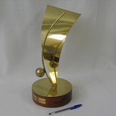 ESCULTURA EM METAL DOURADO (31 CM) COMPOSTA POR UM BERIMBAU E UMA PLACA TRIANGULAR FIXADA NA VERTICAL, COM ENVERGADURA PARA TRÁS. AMBOS FIXADOS EM BASE CIRCULAR (17,5X5,5 CM) DE MADEIRA COM ACABAMENTO EM METAL DOURADO. NA PARTE SUPERIOR DA BASE, 'VISITA DO PRESIDENTE LULA À VERACEL, 21 DE JANEIRO DE 2005'. NA FRENTE, 'VERACEL / ARACRUZ / STORAENSO'. ATRÁS, 'MÚLTIPLOS 1X200 / TATTI MORENO'.