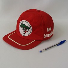 BONÉ EM TECIDO VERMELHO. NA FRENTE, SÍMBOLO DO 'MOVIMENTO DOS TRABALHADORES RURAIS SEM TERRA / BRASIL'. NAS LATERAIS, 'REFORMA AGRÁRIA / POR UM BRASIL SEM LATIFÚNDIO' E 'REGIONAL EXTREMO SUL-BA'.