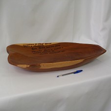 GAMELA (55X30X7 CM) EM FORMATO DE FOLHA, ESCULPIDA EM MADEIRA. NA PARTE INTERNA, 'LENBRAMÇA DO PAJÉ ITAMBÉ PARA O PRESIDENTE LUIZ INACIO LULA DA SILVA / PRIMEIRO ÍNDIO A FUNDAR A ALDEIA PATAXÓ DE COROA VERMELHA - BA'.