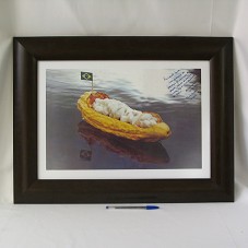 QUADRO (64,5X49 CM) COM FOTOGRAFIA (45X29 CM) DE UM CACAU EM FORMATO DE BARCO, COM BANDEIRA DO BRASIL FIXADA NELE, IMERSO EM ÁGUA. POSSUI MOLDURA EM MADEIRA ESCURA. NO CANTO SUPERIOR DIREITO, 'PRESIDENTE LULA, UMA LEMBRANÇA DA POPULAÇÃO DO MUNICÍPIO DE ITAPEBI, QUANDO DA SUA VISITA A NOSSA REGIÃO DO EXTREMO SUL DA BAHIA. GRANDE ABRAÇO, 21.01.2005 / CLAUDIO CARVALHO / PREFEITO'.