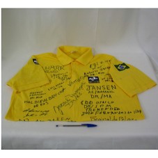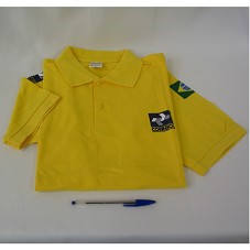 CAMISA GOLA PÓLO (TAM M), NA COR AMARELA. NA FRENTE E NA MANGA DIREITA, LOGOMARCA DO 'CORREIOS'; NA MANGA ESQUERDA, A BANDEIRA DO BRASIL. CAMISA ASSINADA PELOS VINTE E CINCO CARTEIROS-PADRÃO 2005.