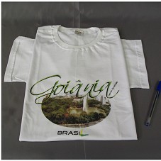 CAMISETA (TAM GG) EM MALHA BRANCA, DE MANGA CURTA. NA FRENTE, FOTOGRAFIA ESTAMPADA DA CIDADE DE GOIÂNIA E 'GOIÂNIA CAPITAL DO CERRADO / BRASIL'. ATRÁS, 'PROJETO ALERTA / WWW.JOAOCAETANO.COM' E A BANDEIRA DO BRASIL.