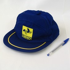 BONÉ EM TECIDO AZUL MARINHO, COM DETALHE AMARELO NA VISEIRA. NA FRENTE, LOGOMARCA DO 'CORREIOS' EM AMARELO.