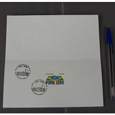 SELO POSTAL (40X30 MM) COM LOGOMARCA DO 'PROGRAMA FOME ZERO', COLADO EM PAPEL CARTÃO COM MARCA-D'ÁGUA DOS 'CORREIOS' E CARIMBO 'CTCE - GOIÁS / CENTRO DE TRATAMENTO DE CARTAS E ENCOMENDAS - GOIÁS / CORREIOS / APARECIDA DE GOIÂNIA - GO / 25.1.2005'. ACOMPANHA 'EDITAL 19-2003', COM TEXTO 'PROGRAMA FOME ZERO' DE 'JOSÉ GRAZIANO DA SILVA', MINISTRO DO MESA; E COM DETALHES TÉCNICOS E DESCRIÇÃO DO SELO. ACONDICIONADO EM PASTA PRETA, COM LOGOMARCA DO 'CORREIOS' NA FRENTE E FITA AMARELA E VERDE NA CAPA.