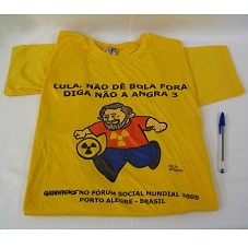 CAMISETA (TAM G) EM MALHA AMARELA, DE MANGA CURTA. POSSUI DESENHO DE AUTORIA DE FÉLIX REINERS, DO PRESIDENTE LULA CHUTANDO UMA BOLA COM SÍMBOLO RADIOATIVO; E A INSCRIÇÃO 'LULA, NÃO DÊ BOLA FORA / DIGA NÃO A ANGRA 3 / GREENPEACE NO FÓRUM SOCIAL MUNDIAL 2005 / PORTO ALEGRE - BRASIL'.