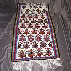 TAPETE (92,5X174,5 CM) EM LINHA, COM MOTIVOS GEOMÉTRICOS REPETIDOS, NAS CORES AZUL, VERMELHO, VERDE, BRANCO E PRETO, PREDOMINANDO AS DUAS PRIMEIRAS, EM FUNDO BRANCO. BORDAS NAS CORES PRETO, MARROM, AZUL E VERMELHO. POSSUI FRANJAS NAS EXTREMIDADES DA LARGURA.