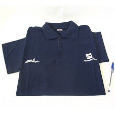 CAMISA GOLA PÓLO (TAM GG) NA COR AZUL MARINHO, DE MANGA CURTA. NA FRENTE, BORDADO EM BRANCO, 'REDE GAS ENERGIA / BR PETROBRAS'.