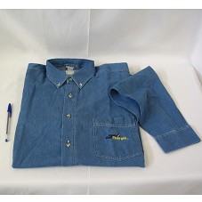 CAMISA JEANS (TAM G) NA COR AZUL, DE MANGA COMPRIDA. NA FRENTE, BORDADO EM AZUL E AMARELO, NO BOLSO, 'REDE GAS ENERGIA'. ATRÁS, EM BRANCO, VERDE E AMARELO, 'BR PETROBRAS'.