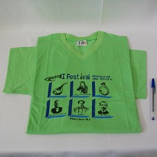 CAMISETA (TAM GG) EM MALHA VERDE, DE MANGA CURTA E GOLA EM 'V'. NA FRENTE, ESTAMPA COM FOTOGRAFIAS DE 'CHIQUINHA GONZAGA / ANACLETO DE MEDEIROS / CALADO / ERNESTO NAZARETH' E INSTRUMENTOS, TENDO AINDA A INSCRIÇÃO 'I FESTIVAL NACIONAL DE CHORO / MENDES-RJ'. ATRÁS, 'ELPASO / ESCOLA PORTÁTIL DE MÚSICA / OFICINA DO CHORO'.