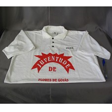 CAMISA GOLA PÓLO NA COR BRANCA, DE MANGA CURTA. NA FRENTE, ESTAMPA EM VERMELHO 'JUVENTUDE DE FLORES DE GOIÁS' E BORDADO EM PRATA E PRETO 'FREE BOYS'. ATRÁS, DESENHO DA BANDEIRA DO BRASIL EM FORMATO DE FLOR E 'FLORES PARA TODOS / ADM: 2005 A 2008'.