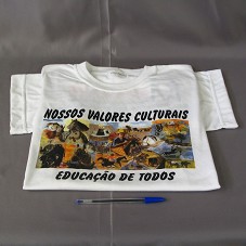 CAMISETA EM MALHA BRANCA, DE MANGA CURTA. NA FRENTE, ESTAMPA COM DESENHOS DE CAVALOS E 'NOSSOS VALORES CULTURAIS / EDUCAÇÃO DE TODOS'. ATRÁS, 'PREFEITURA DE SURUBIM / PARTICIPAÇÃO DE TODOS / SECRETARIA DE EDUCAÇÃO'.