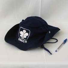 CHAPÉU TIPO AUSTRALIANO, EM TECIDO AZUL MARINHO. NA FRENTE, ESTAMPA EM BRANCO, 'DNOCS' E SÍMBOLO. POSSUI CORDÃO NA MESMA COR DO TECIDO.