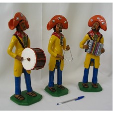 TRÊS ESCULTURAS EM ARGILA (40 CM), FIGURAS MASCULINAS VESTIDAS TIPICAMENTE COMO NORDESTINOS: CALÇA AZUL, SANDÁLIAS DE TIRAS, PALETÓ AMARELO COM LENÇO VERMELHO E CHAPÉU DE COURO (TIPO CANGACEIRO) COM ESTRELAS PRATEADAS. CADA UM TOCANDO UM INSTRUMENTO: TRIÂNGULO, SANFONA E TAMBOR. BASE QUADRADA, EM MESMO MATERIAL, PINTADA DE VERDE. EM DUAS DELAS, NOME DO ARTISTA 'LUIZ ANTÔNIO'.
