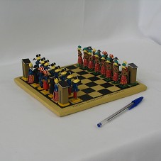 JOGO DE XADREZ EM CERÂMICA, COMPOSTO POR TABULEIRO (22,8X22,8 CM) PINTADO EM CREME E PRETO, COM A INSCRIÇÃO 'PROJETO EMPREENDER - CARUARU - PE'; E PEÇAS (5,5 CM DE ALTURA) CARACTERIZADAS POR PERSONAGENS NORDESTINOS: TRABALHADORES DE ROÇA, PADRES COM BATAS TÍPICAS, TORRES EM FORMA DE CASA, REIS E RAINHAS COMO CANGACEIROS. ACONDICIONADO EM CAIXA (26X26X7,2 CM) DE PAPELÃO VERDE, COM ETIQUETA 'ACIC / ASSOCIAÇÃO COMERCIAL E EMPRESARIAL DE CARUARU / FACEP / FEDERAÇÃO DAS ASSOCIAÇÕES COMERCIAIS DO ESTADO DE PERNAMBUCO'.