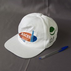 BONÉ EM BRIM BRANCO. NA FRENTE, 'ASCES / ASSOCIAÇÃO CARUARUENSE DE ENSINO SUPERIOR / 45 ANOS' E LOGOMARCA. NAS LATERAIS, 'BRASIL SORRIDENTE / A SAÚDE BUCAL LEVADA A SÉRIO' E LOGOMARCA; E, 'PROJETO ASA BRANCA / PROGRAMA DE COMBATE AO CÂNCER DE BOCA', COM SÍMBOLO.