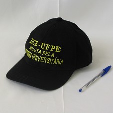 BONÉ EM BRIM PRETO. NA FRENTE, BORDADO EM AMARELO, 'DCE - UFPE / NA LUTA PELA REFORMA UNIVERSITÁRIA'.